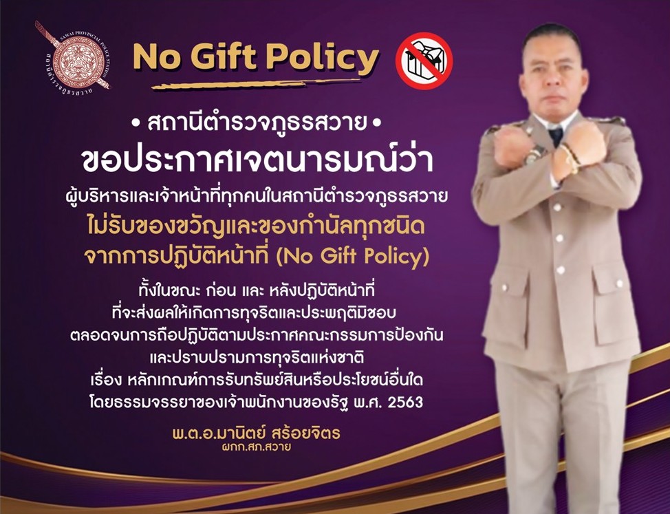 - ประกาศสำนักงานยุทธศาสตร์ตำรวจเรื่องเจตนารมณ์ที่จะไม่รับของขวัญหรือของกำนัลทุกชนิดจากการปฏิบัติหน้าที่