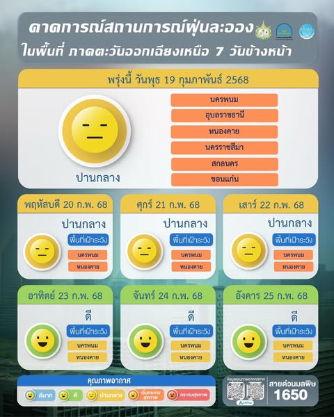 📍ผลการคาดการณ์สถานการณ์ฝุ่นละออง 7 วันข้างหน้า ระหว่างวันที่ 19 – 25 กุมภาพันธ์ 2568 17 กุมภาพันธ์ 2568 โดย adminsawai01