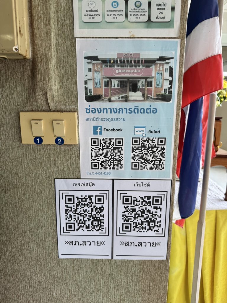 ประชาสัมพันธ์ QR CODE ช่องทางติดต่อ Facebook และเว็บไซต์ บริเวณทางเข้าสภ.สวาย
